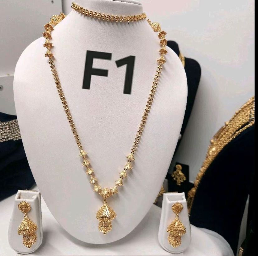 Crafted with a radiant 22ct gold plating, the necklace drapes beautifully across the neckline while the matching earrings add the perfect statement touch. Whether styled with a sleek abaya, a silk slip dress, or layered over an evening look, this set instantly elevates your presence.