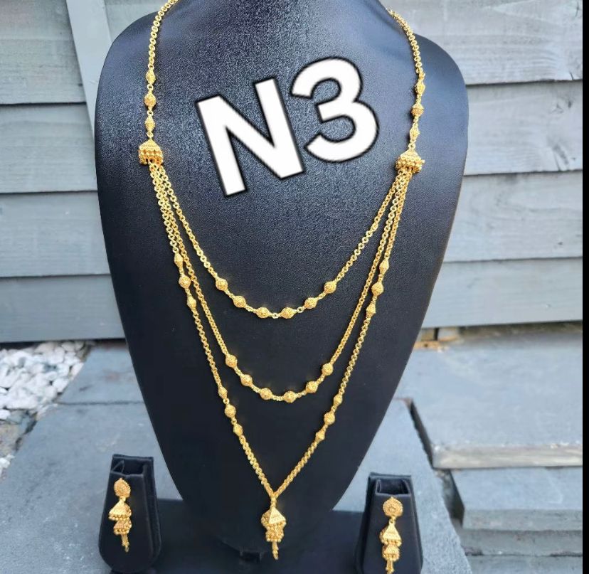 Crafted with a radiant 22ct gold plating, the necklace drapes beautifully across the neckline while the matching earrings add the perfect statement touch. Whether styled with a sleek abaya, a silk slip dress, or layered over an evening look, this set instantly elevates your presence.