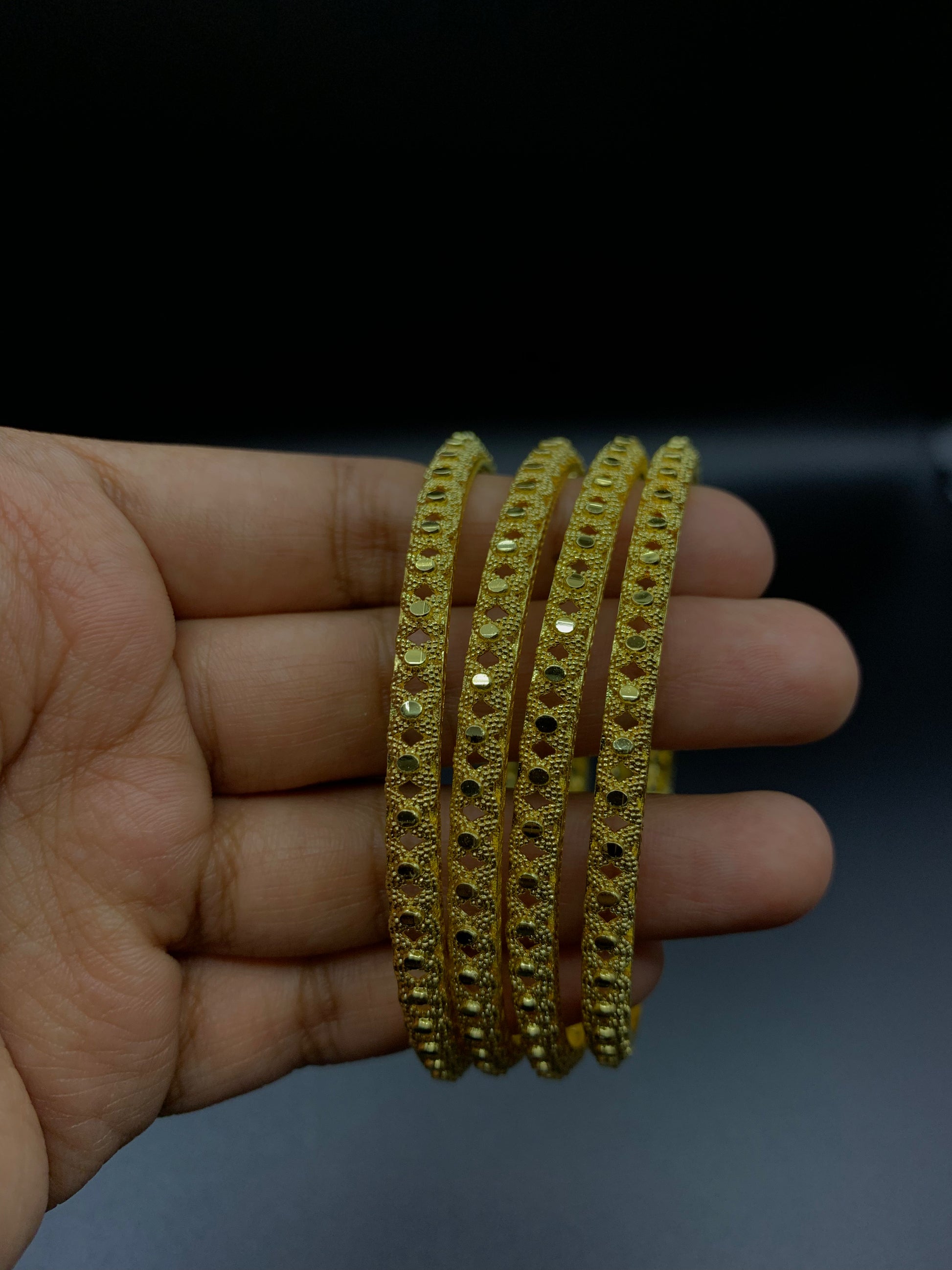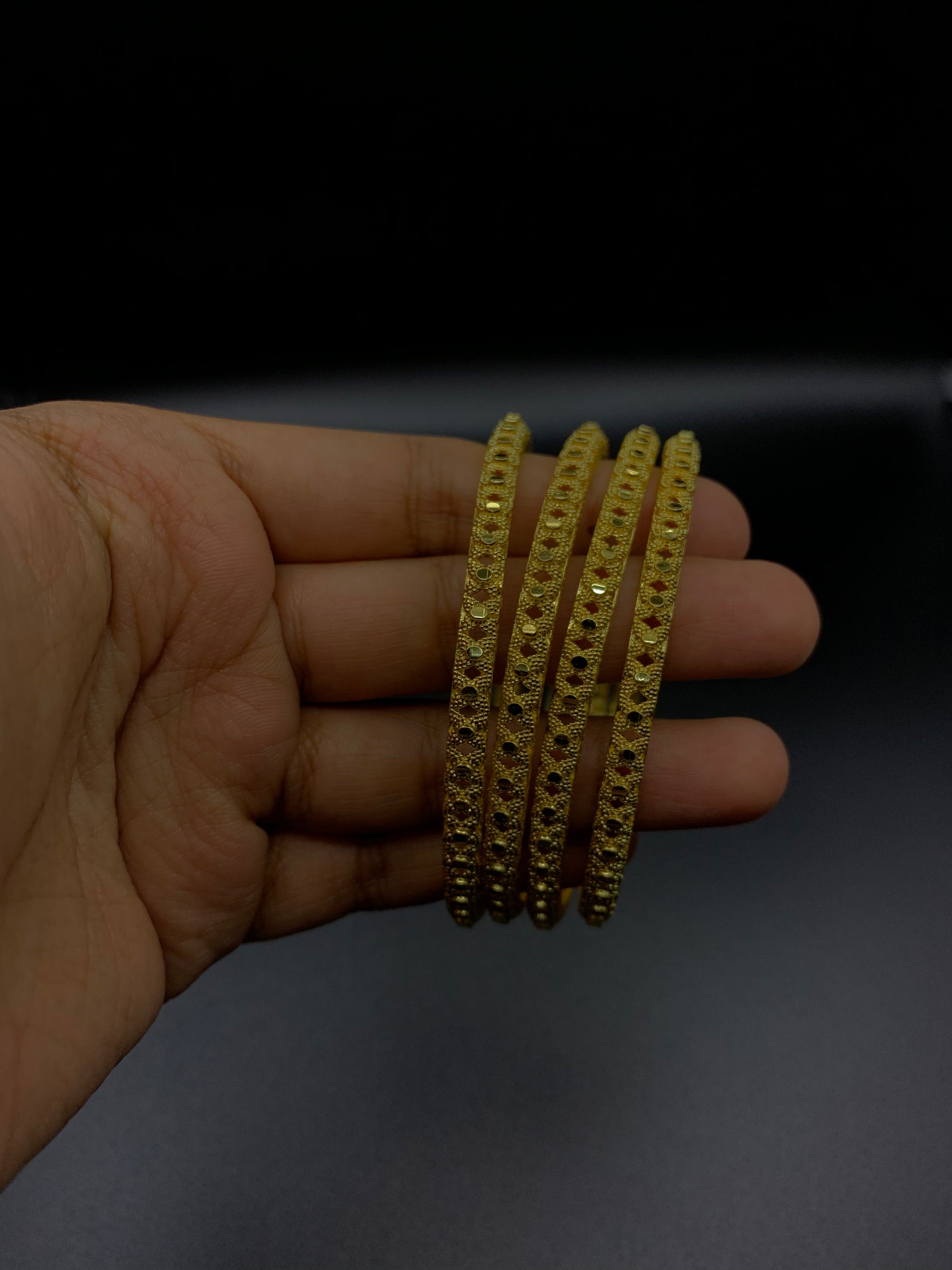 Celebrate every moment in golden style — Jashan (meaning celebration) is a stunning 4-piece bangle set that combines traditional charm with modern elegance. Each bangle is 22ct gold-plated, featuring intricate detailing that catches the light with every movement.
