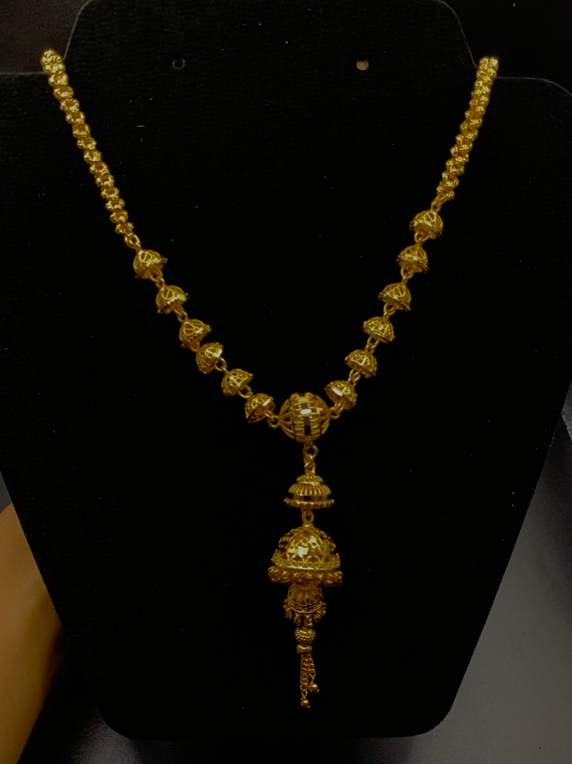 Playful, opulent, and full of charm — Khilona (meaning toy or playful delight) brings a touch of whimsy to traditional elegance. This 22ct gold-plated long mala necklace features delicately suspended jhumkas along its length, creating a rhythmic sway that catches the light beautifully.