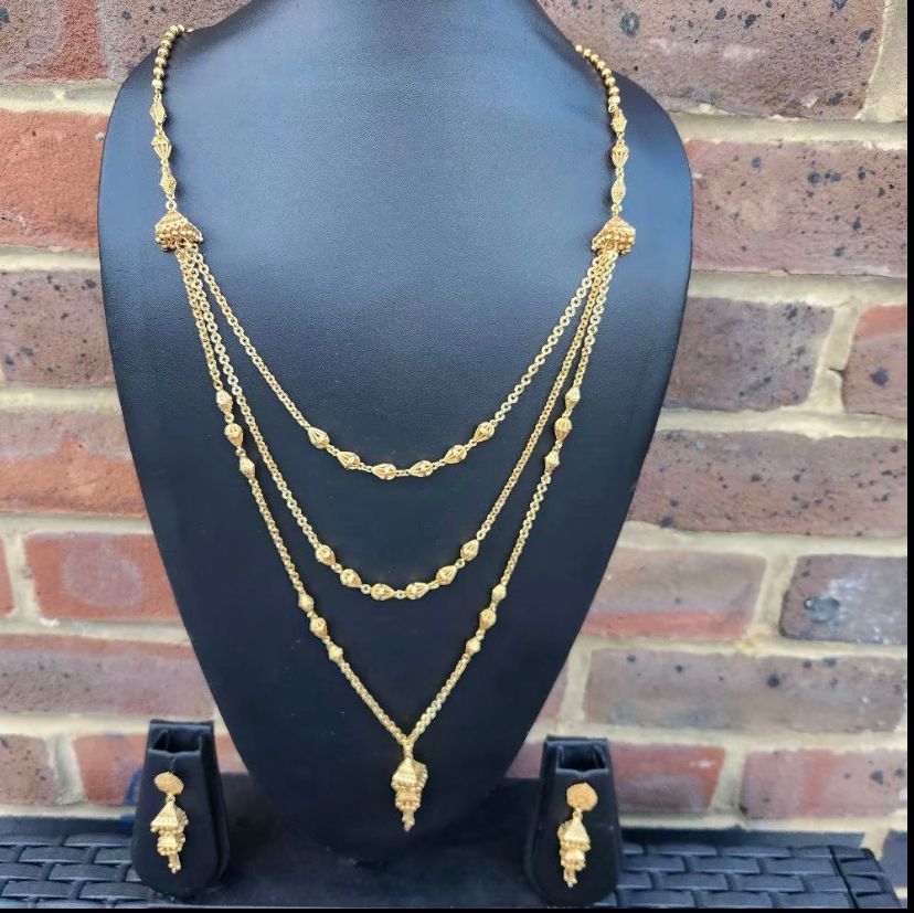 Crafted with a radiant 22ct gold plating, the necklace drapes beautifully across the neckline while the matching earrings add the perfect statement touch. Whether styled with a sleek abaya, a silk slip dress, or layered over an evening look, this set instantly elevates your presence.