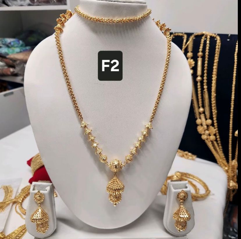 Crafted with a radiant 22ct gold plating, the necklace drapes beautifully across the neckline while the matching earrings add the perfect statement touch. Whether styled with a sleek abaya, a silk slip dress, or layered over an evening look, this set instantly elevates your presence.