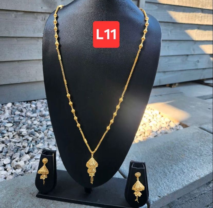Crafted with a radiant 22ct gold plating, the necklace drapes beautifully across the neckline while the matching earrings add the perfect statement touch. Whether styled with a sleek abaya, a silk slip dress, or layered over an evening look, this set instantly elevates your presence.